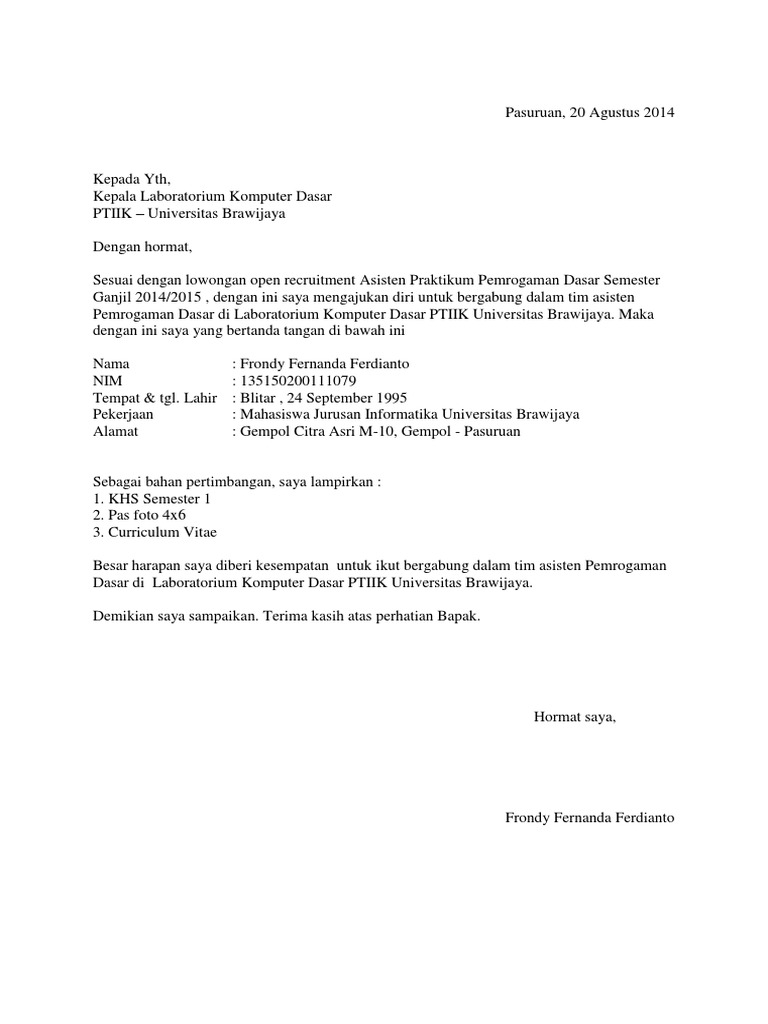 Terbaru. Kunci utama menjadi asisten itu tetap berikut ini akan diberikan contoh cv yang unik untuk melamar menjadi asisten laboratorium. Dengan hormat, sehubungan dengan adanya lowongan penerimaan asisten laboratorium lanjut sistem komputer universitas gunadarma. Contoh surat lamaran sebagai asisten laboraturium.