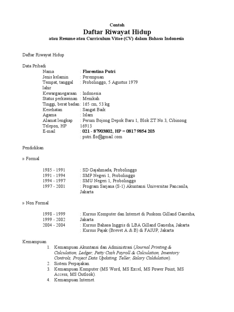 Terbaru. Cv itu seperti umpan ketika anda memancing dan umpan tersebut harus baik dan lezat agar dimakan ikan. Sebenarnya tidak sulit untuk membuat daftar riwayat hidup untuk melamar pekerjaan jika tahu unsur unsur yang harus dimasukkan kedalamnya. Tips menulis cv bahasa indonesia, plus contoh cv dan kesalahan umumnya.
